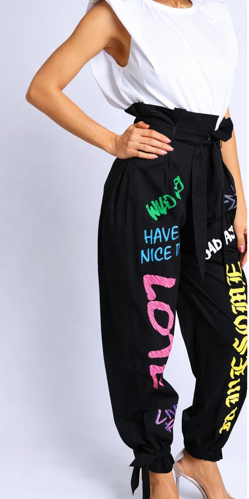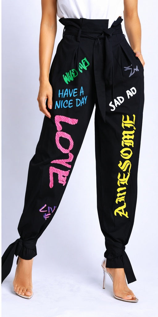 Make a bold statement without sacrificing comfort. These high-waisted graffiti jogger pants are designed for women who love effortless street style with an edge. Featuring vibrant hand-painted inspired lettering, a flattering paper-bag waist, and adjustable ankle ties, these pants are perfect for dressing up or down.